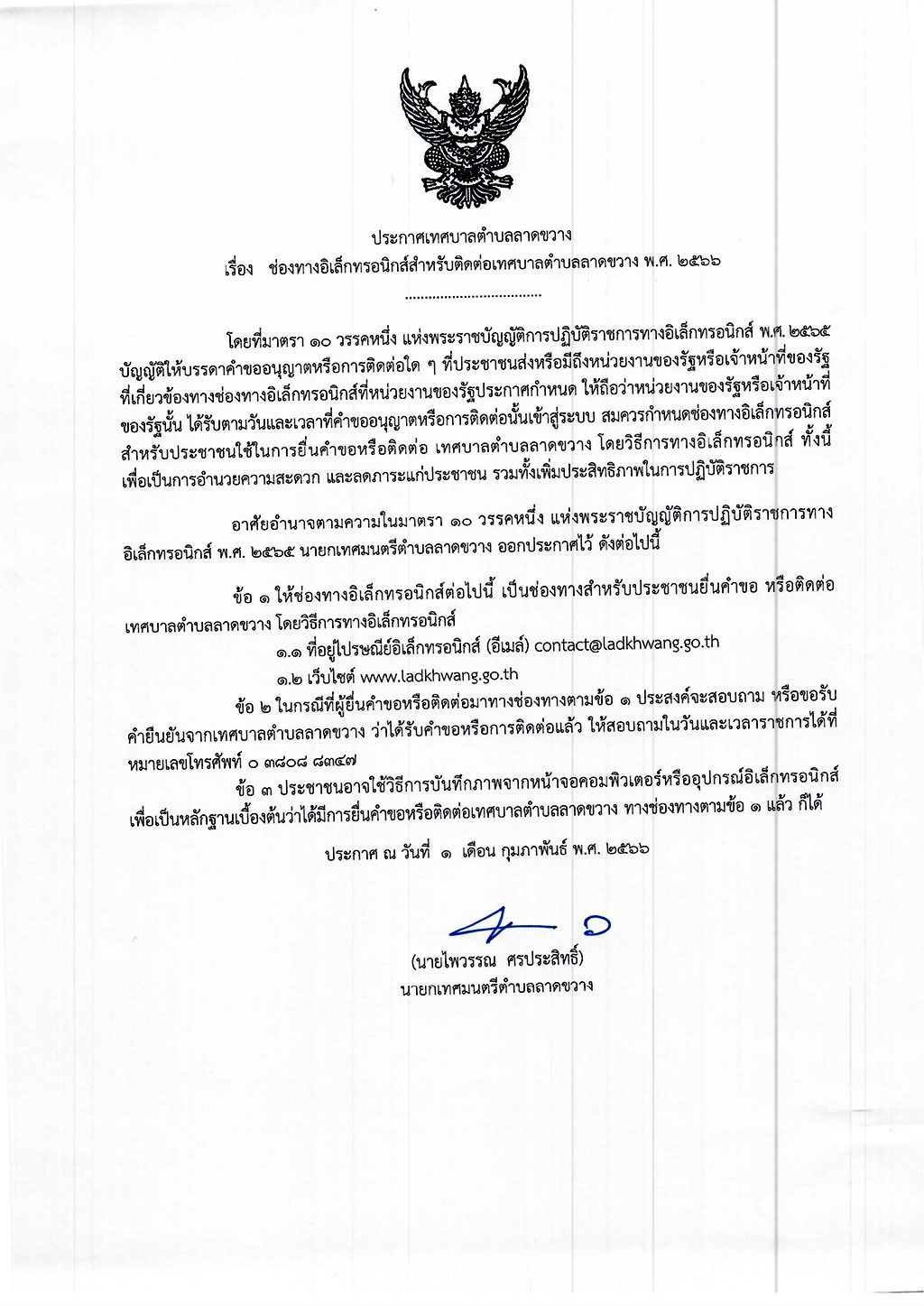 ประกาศเทศบาลตำบลลาดขวาง เรื่อง ช่องทางอิเล็กทรอนิกส์สำหรับติดต่อเทศบาลตำบลลาดขวาง พ.ศ.2566