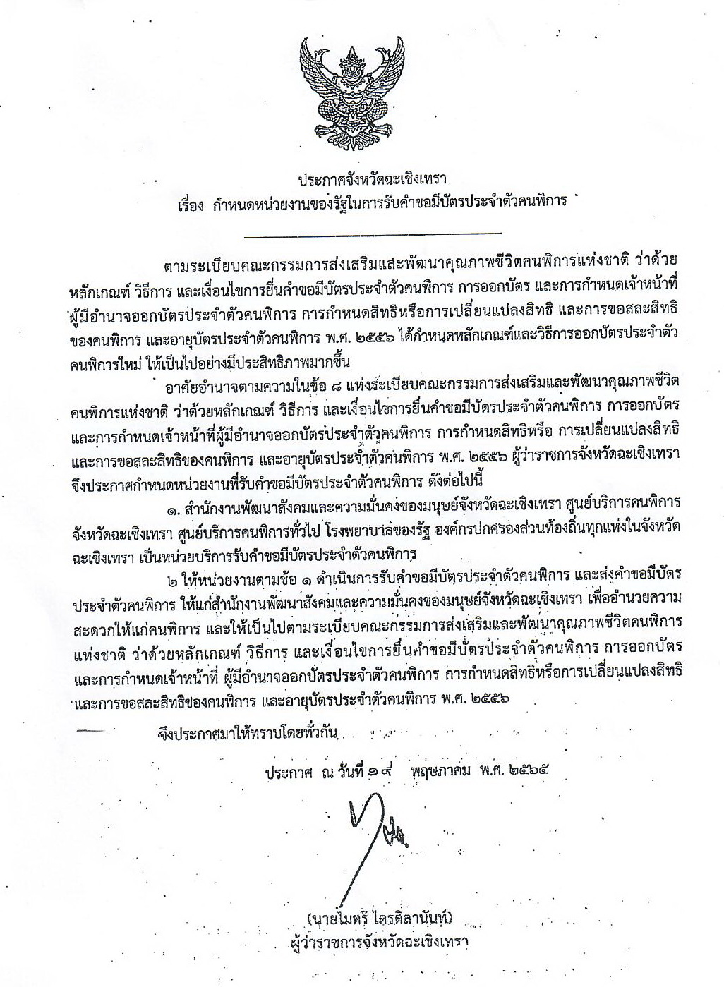ประกาศ เรื่องกำหนดหน่วยงานของรัฐในการรับคำขอมีบัตรประจำตัวคนพิการ