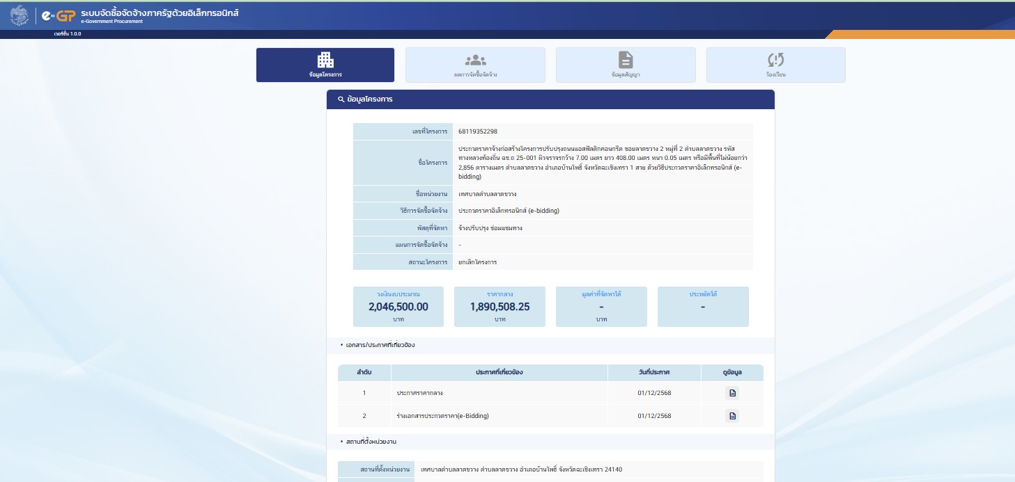 ประกาศยกเลิก (ร่าง) โครงการปรับปรุงถนนแอสฟัลติกคอนกรีต ซอยลาดขวาง 2 หมู่ที่ 2 ด้วยวิธีประกวดราคาอิเล็กทรอนิกส์ (e-bidding)