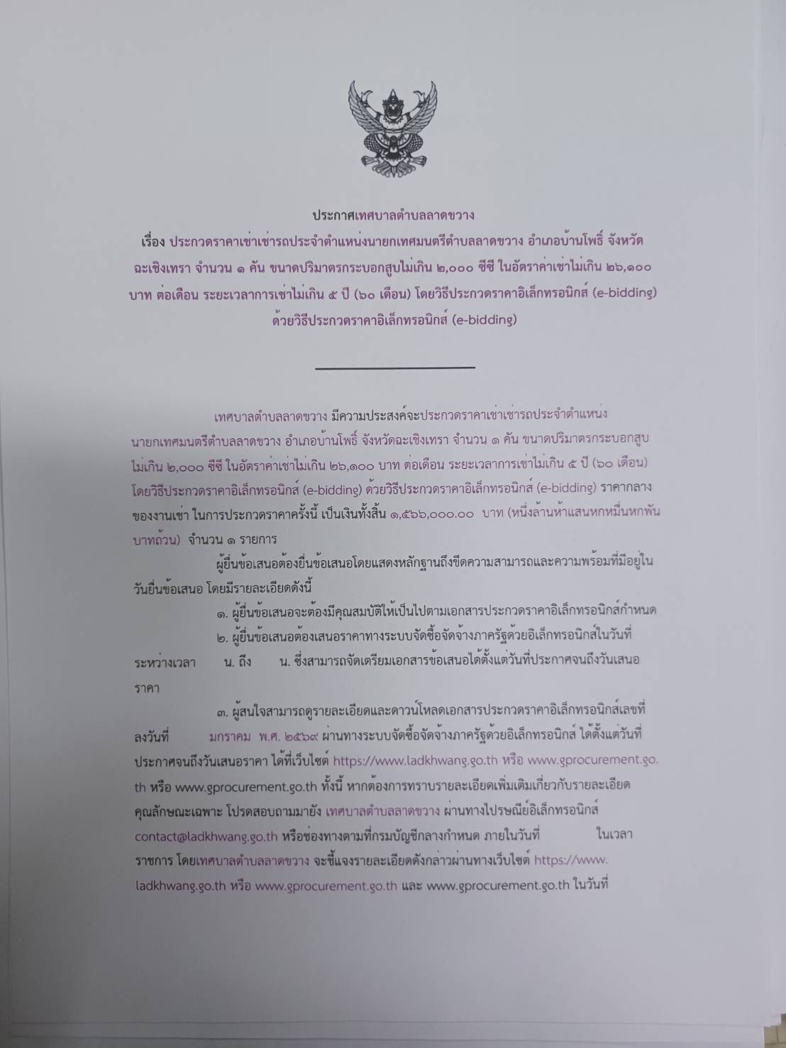 ประกาศร่าง TOR โครงการเช่ารถประจำตำแหน่งนายกเทศมนตรีตำบลลาดขวาง จำนวน 1 คัน โดยวิธีประกวดราคาอิเล็กทรอนิกส์ (e-bidding)