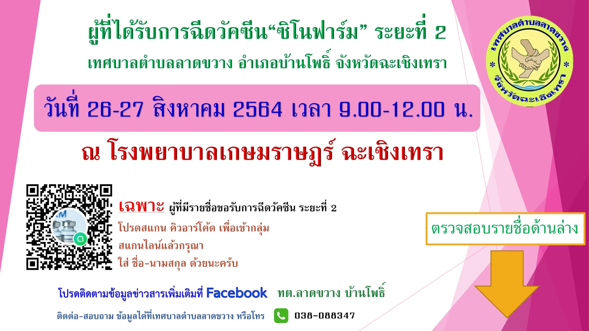 โครงการฉีดวัคซีน "ชิโนฟาร์ม" ระยะที่ 2 ประกาศรายชื่อผู้ที่ได้รับการฉีดวัคซีน ระหว่างวันที่ 26-27 สิงหาคม 2564