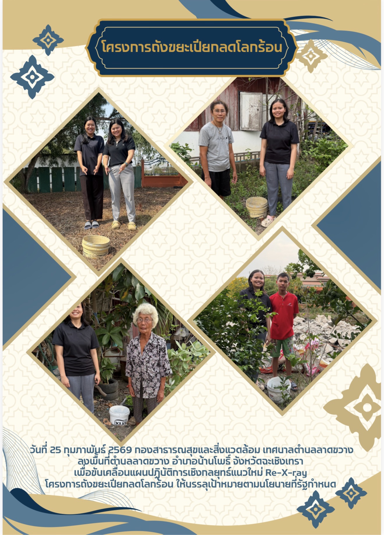 วันที่ 25 กุมภาพันธ์ 2569 กองสาธารณสุขและสิ่งแวดล้อม เทศบาลตำบลลาดขวาง ลงพื้นที่ตำบลลาดขวาง อำเภอบ้านโพธิ์ จังหวัดฉะเชิงเทรา เพื่อขับเคลื่อนแผนปฏิบัติการเชิงกลยุทธ์แนวใหม่ Re-X-ray โครงการถังขยะเปียกลดโลกร้อน ให้บรรลุเป้าหมายตามนโยบายที่รัฐกำหนด