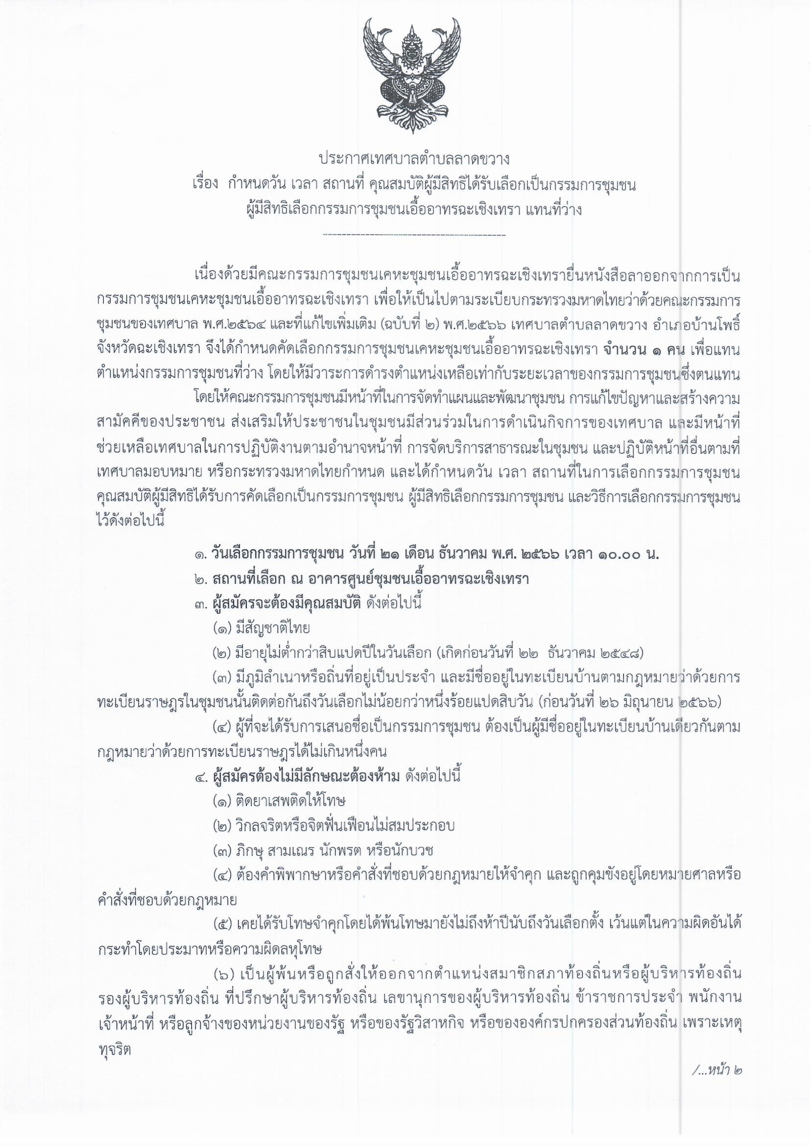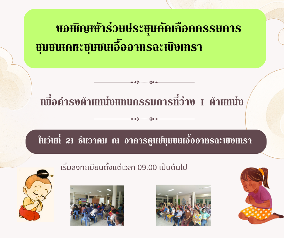 ขอเชิญเข้าร่วมประชุมคัดเลือกกรรมการชุมชนเอื้ออาทรฉะเชิงเทรา ในวันที่ 21 ธันวาคม 2566