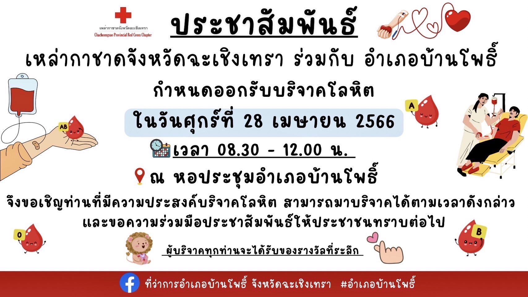 กำหนดรับบริจาคโลหิตในวันศุกร์ที่ 28 เมษายน 2566 ณ หอประชุมอำเภอ