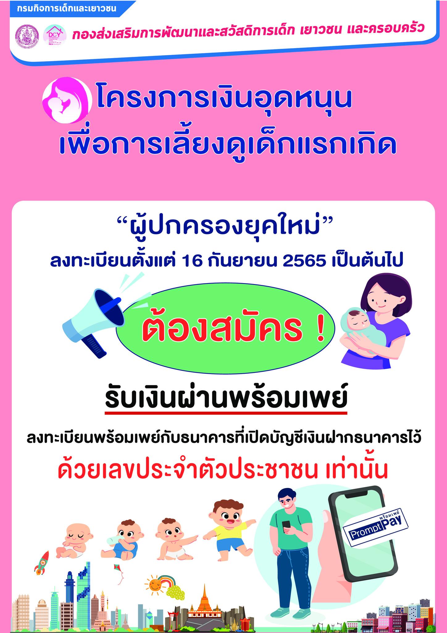 โครงการเงินอุดหนุนเพื่อการเลี้ยงดูเด็กแรกเกิด ผู้ปกครองที่จะยื่นลงทะเบียน ตั้งแต่ 16 ก.ย.65 เป็นต้นไป ต้องสมัครรับเงินผ่านพร้อมเพย์ ด้วยเลขประจำตัวประชาชนเท่านั้น ปัจจุบัน สามารถเช็คสิทธิ/ติดตามสถานะการรับเงินผ่านแอปพลิเคชั่น "เงินเด็ก" ได้แล้ว