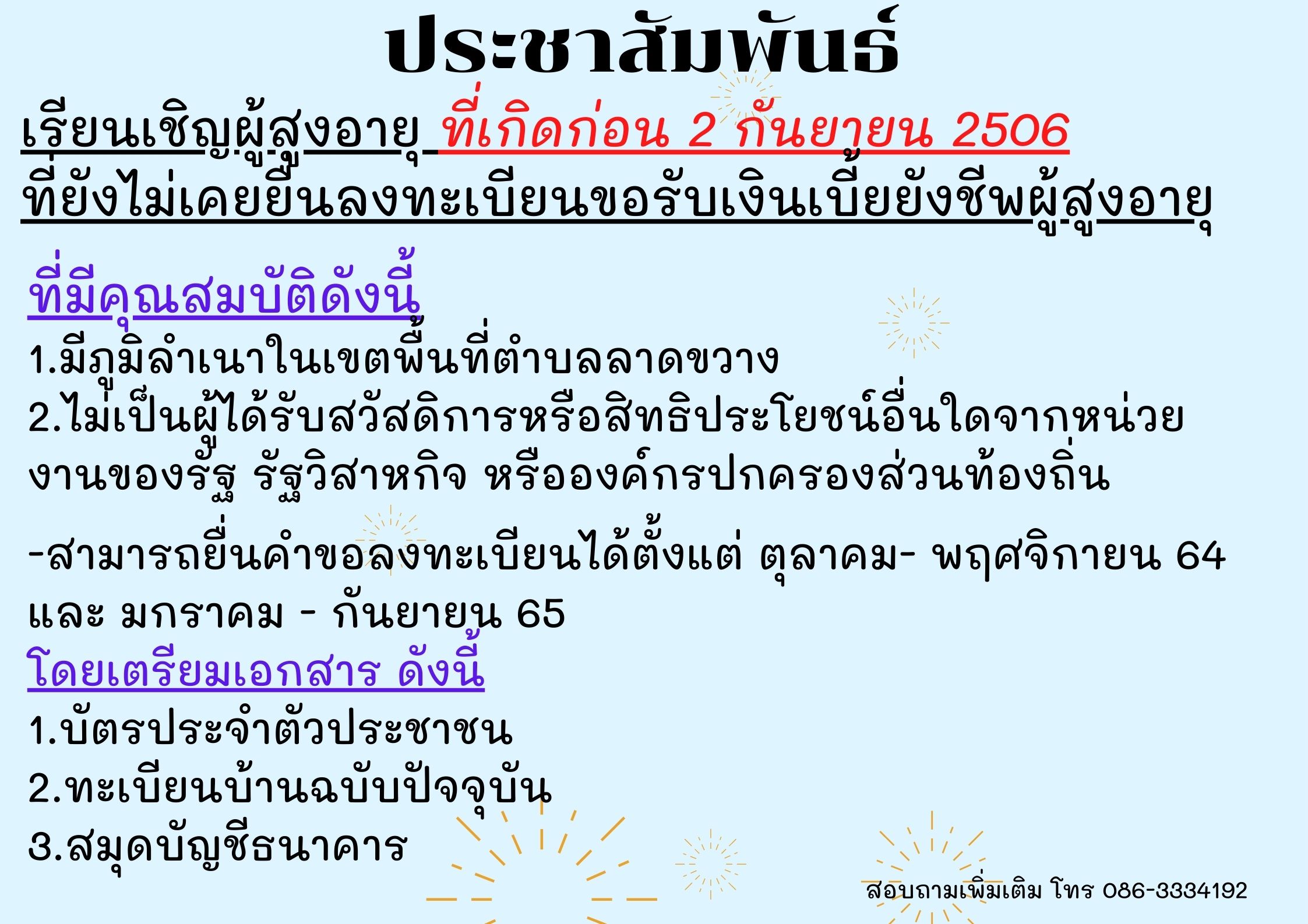 เรียนเชิญผู้สูงอายุที่เกิดก่อน 2 กันยายน 2506 ที่ยังไม่เคยยื่นลงทะเบียนขอรับเงินเบี้ยยังชีพผู้สูงอายุ